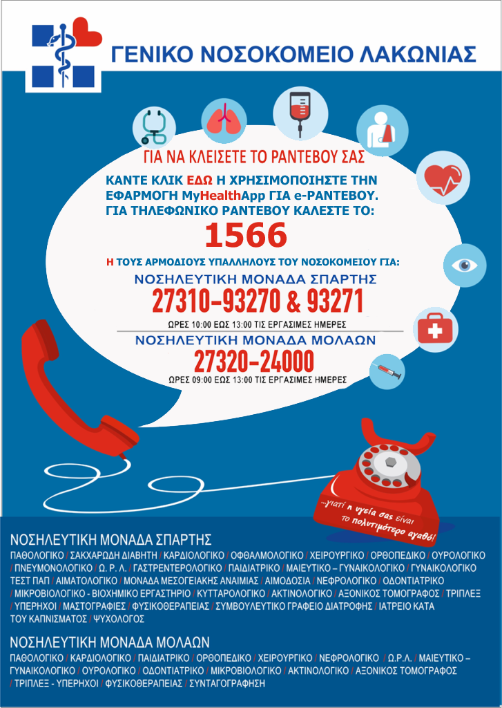 Σας ενημερώνουμε ότι από 1/10/2025 ο τρόπος κλεισίματος ραντεβού με κάποιο από τα Εξωτερικά Ιατρεία των Νοσηλευτικών Μονάδων μας άλλαξε. Μπορείτε να καλείτε τον αριθμό 1566 (Χωρίς Χρέωση), να επισκεφθείτε την πύλη finddoctors.gov.gr ή να χρησιμοποιήσετε την εφαρμογή MyHealthApp Επίσης μπορείτε να επικοινωνήστε με τους αρμόδιους υπάλληλους μας, στα τηλέφωνα που αναφέρονται παρακάτω.